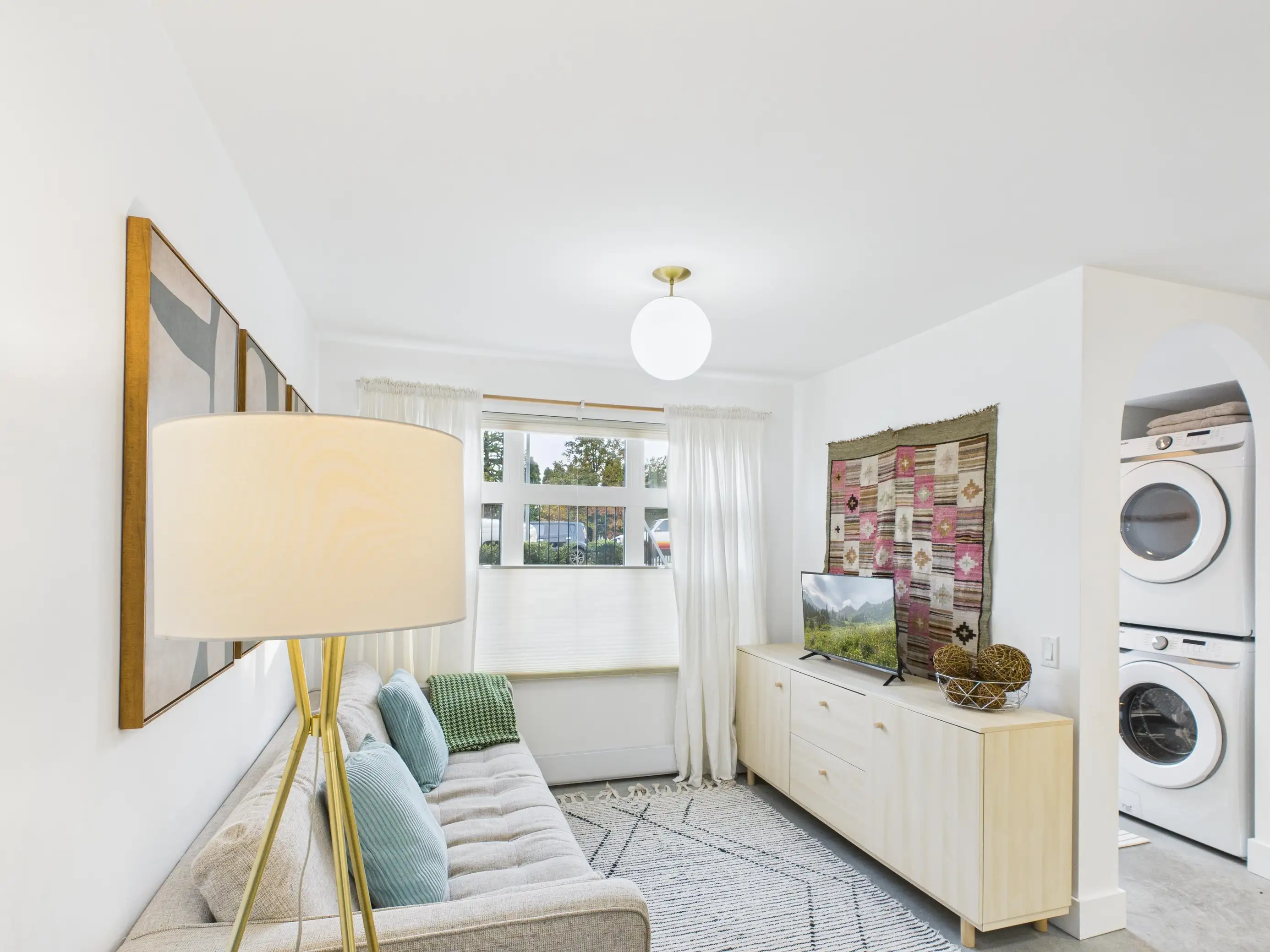 Cozy living room with stylish decor, comfortable sofa, 32" smart TV, and natural light - property