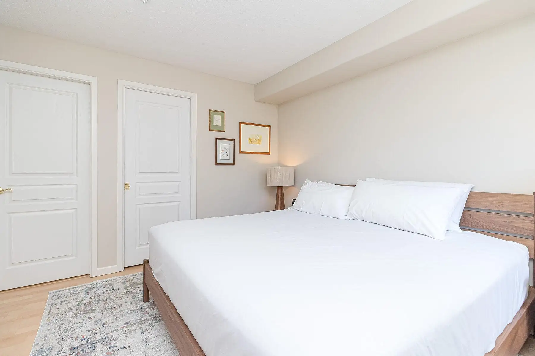 Master bedroom with king-sized bed and modern wooden accents