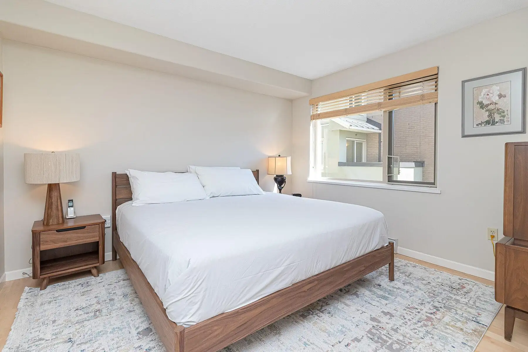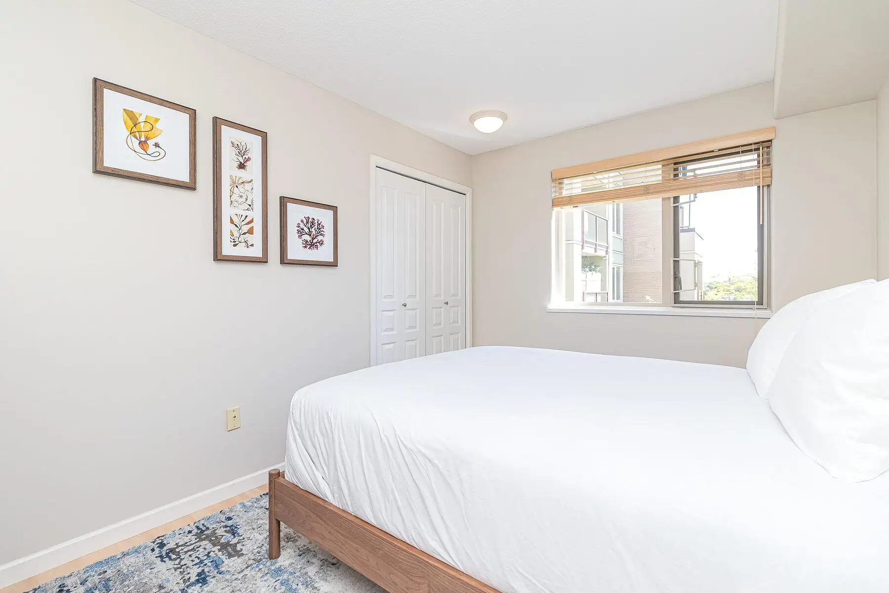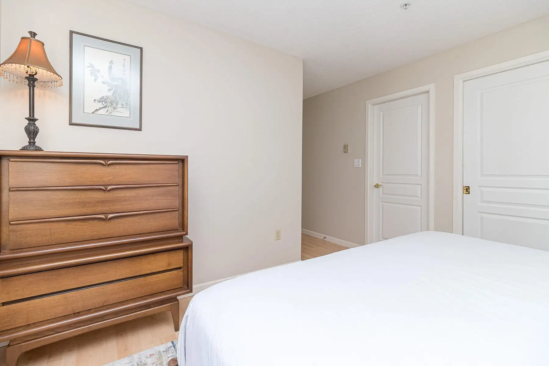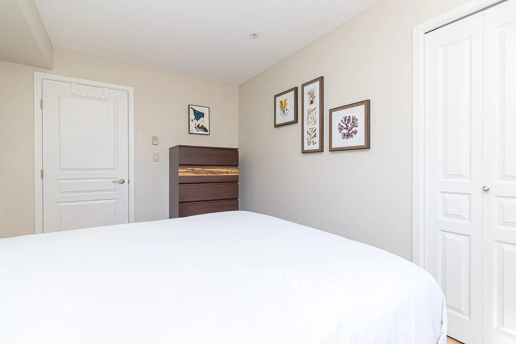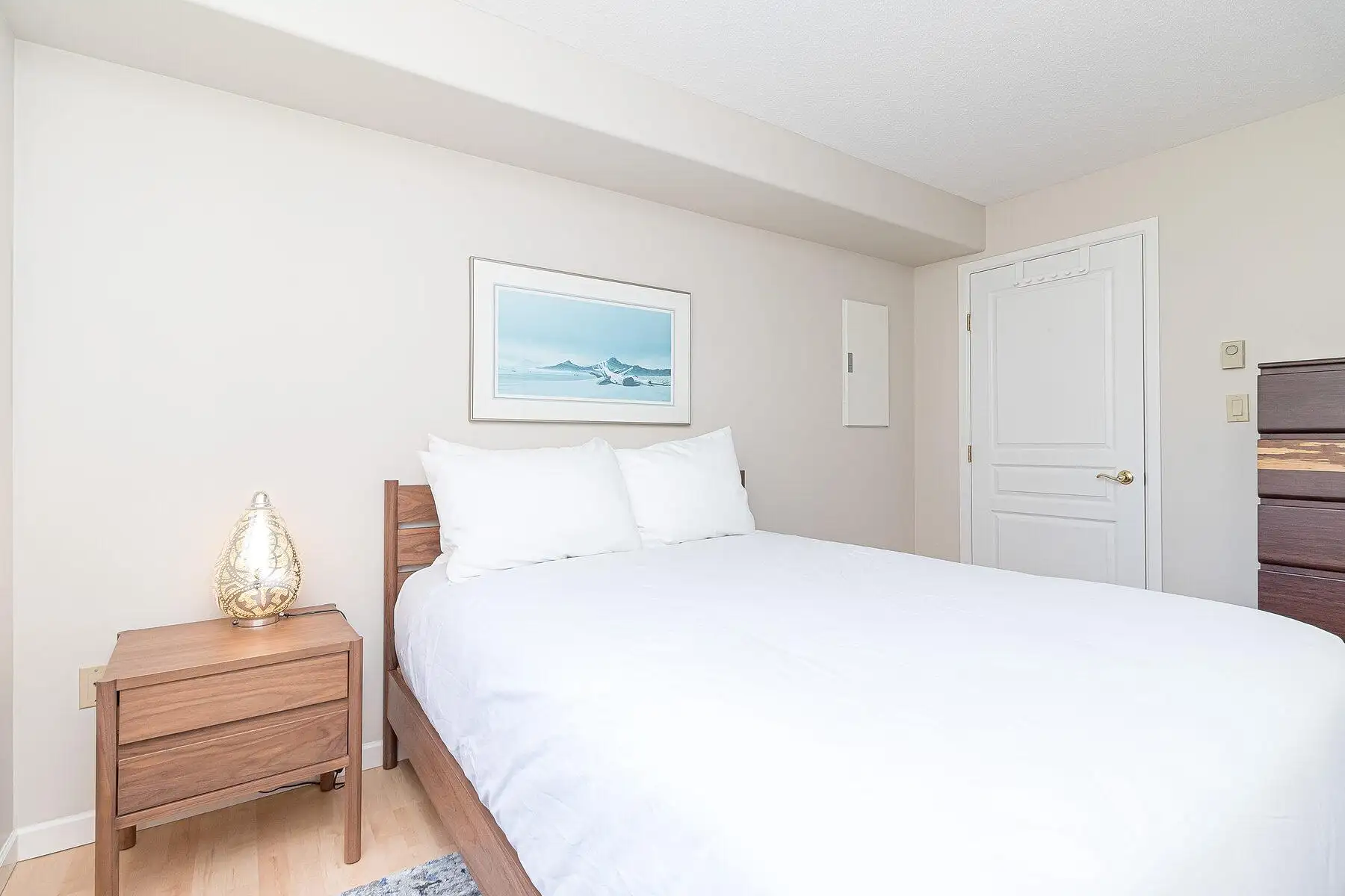 Second bedroom with calming coastal artwork and warm lighting