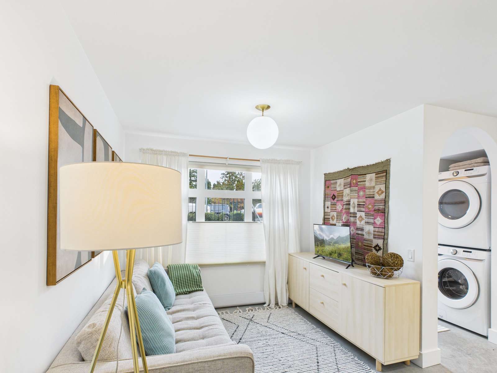 Step into modern ease with direct patio access to this south-facing 1-bed suite, polished concrete floors, triple-pane windows and a spa-style soaker tub. Walk to Westside Village, the waterfront trail and downtown — no car required!