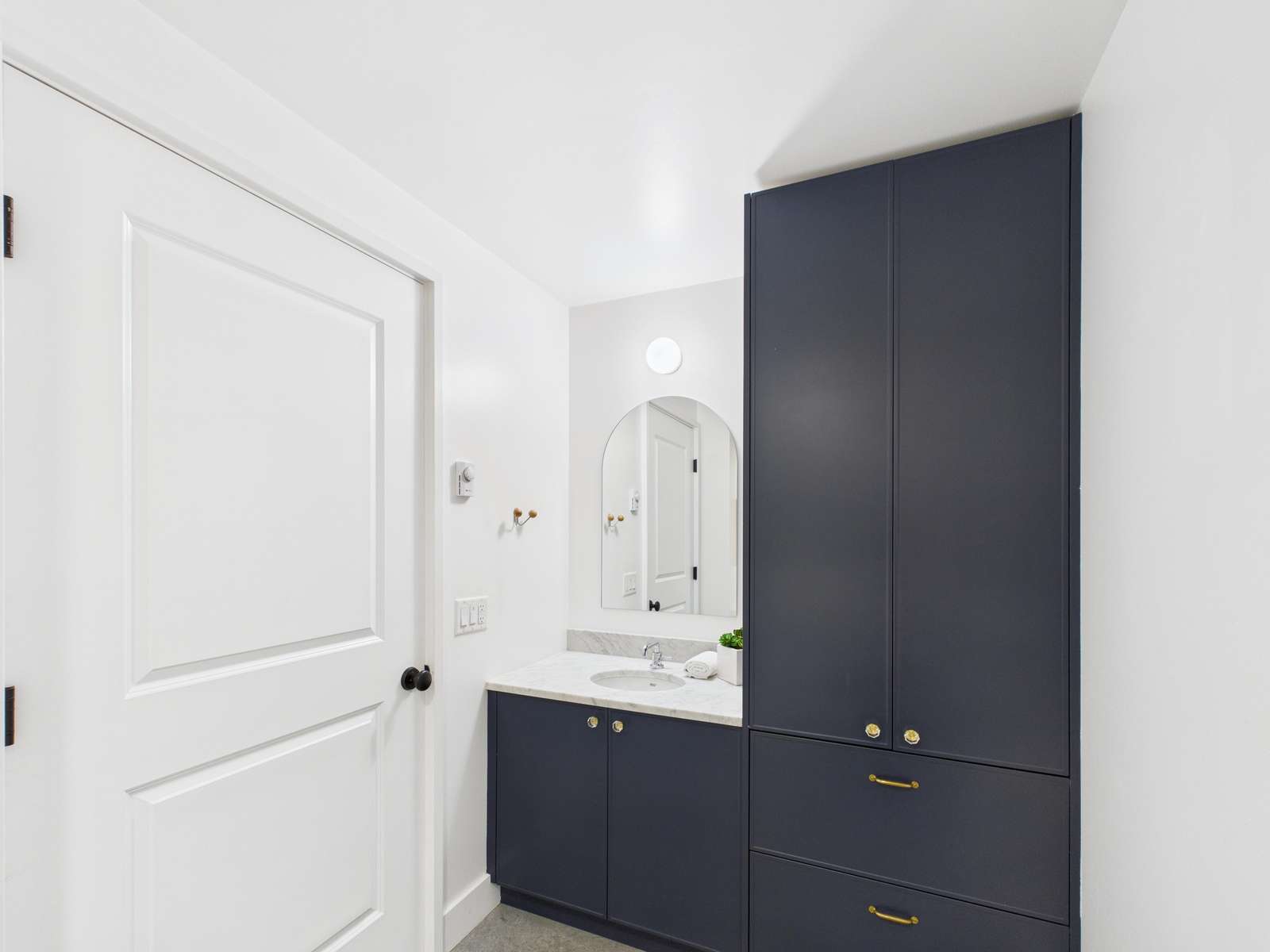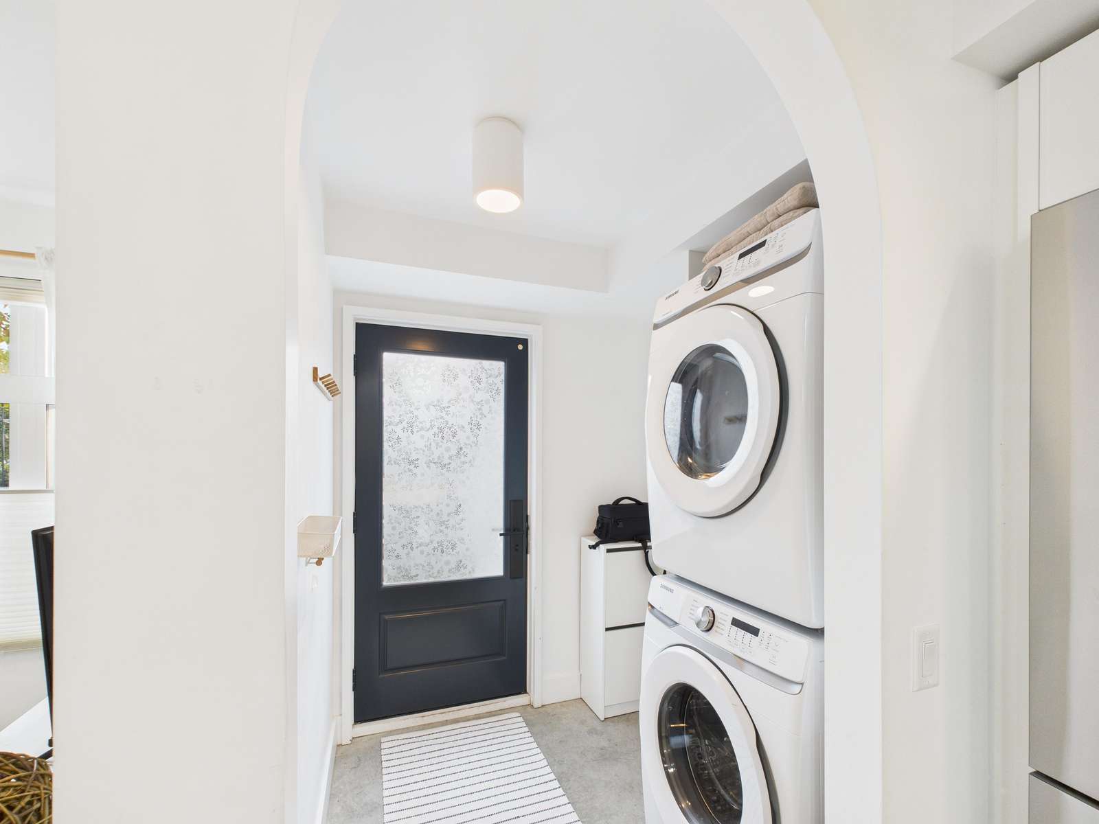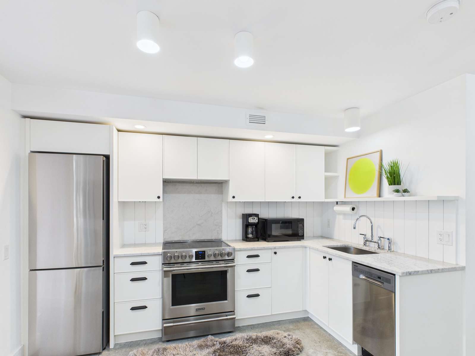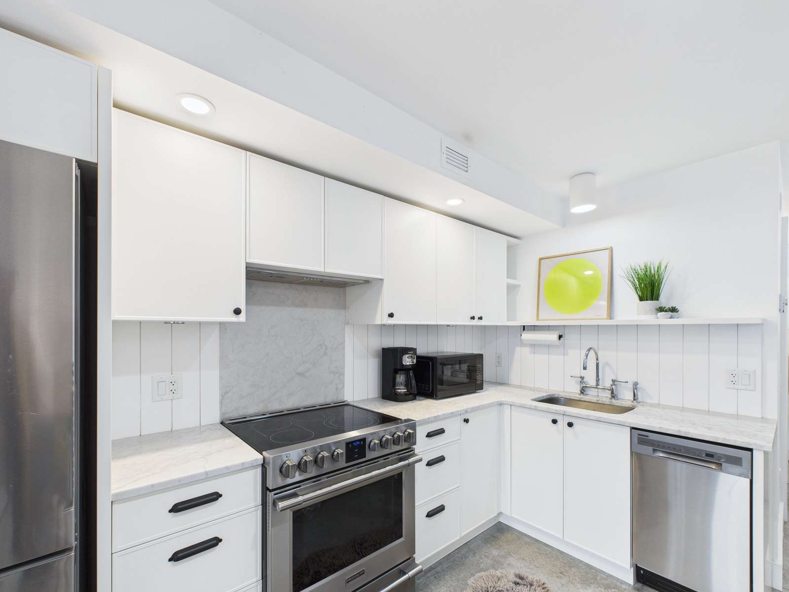 Built in 2021, this stylish one-bedroom home offers the perfect blend of convenience, privacy, and contemporary design. With its own private exterior entrance, you can step directly into your space without the hassle of elevators or shared hallways — ideal for pet owners or anyone who values independence and ease of access. Inside, you’ll find a bright and open layout enhanced by polished concrete floors, triple-paned windows, and a built-in air exchanger for year-round comfort. The kitchen is a true highlight, featuring elegant white marble countertops, sleek cabinetry, and premium stainless-steel appliances, including an air-fryer oven for easy, healthy cooking.
