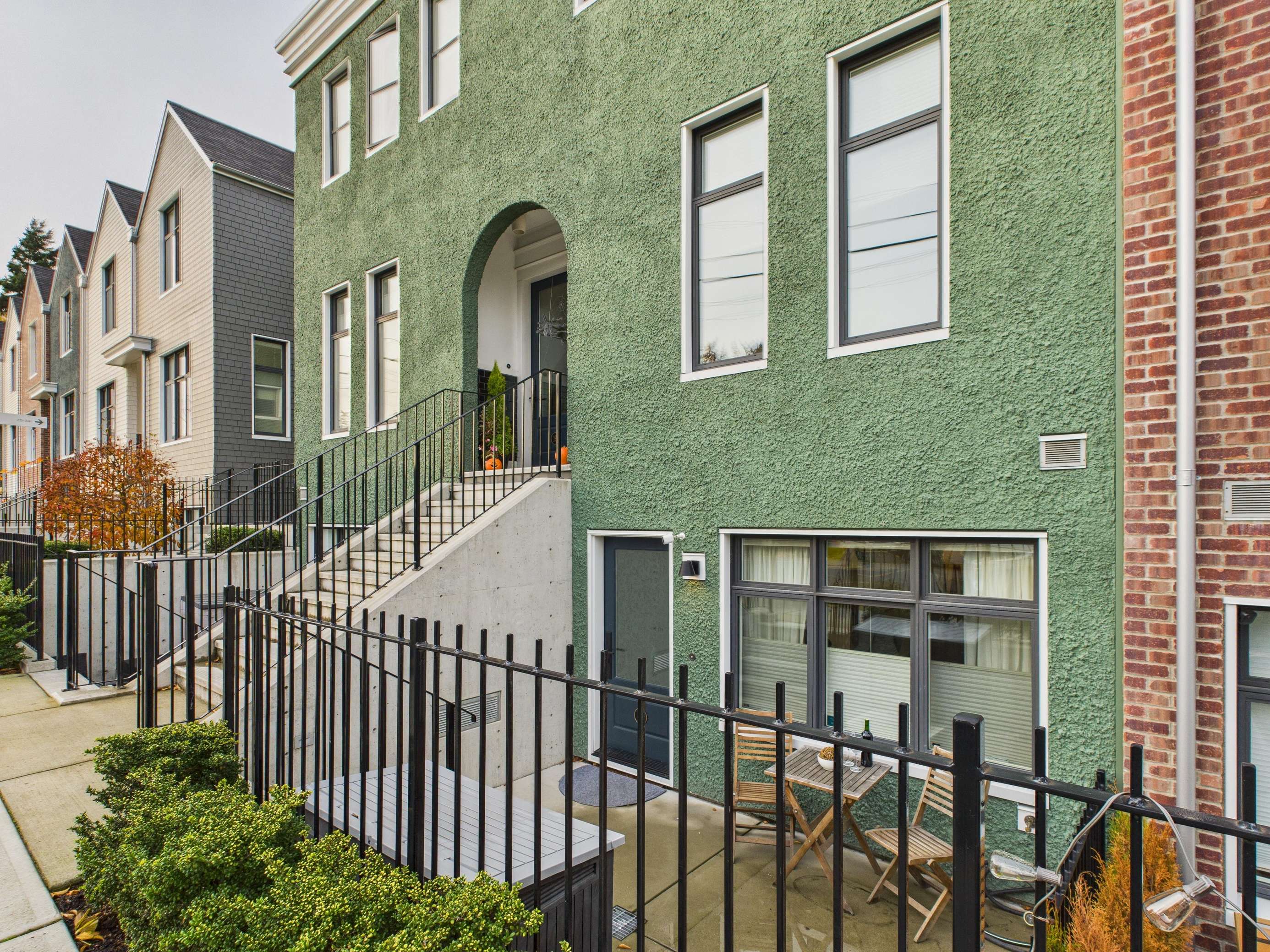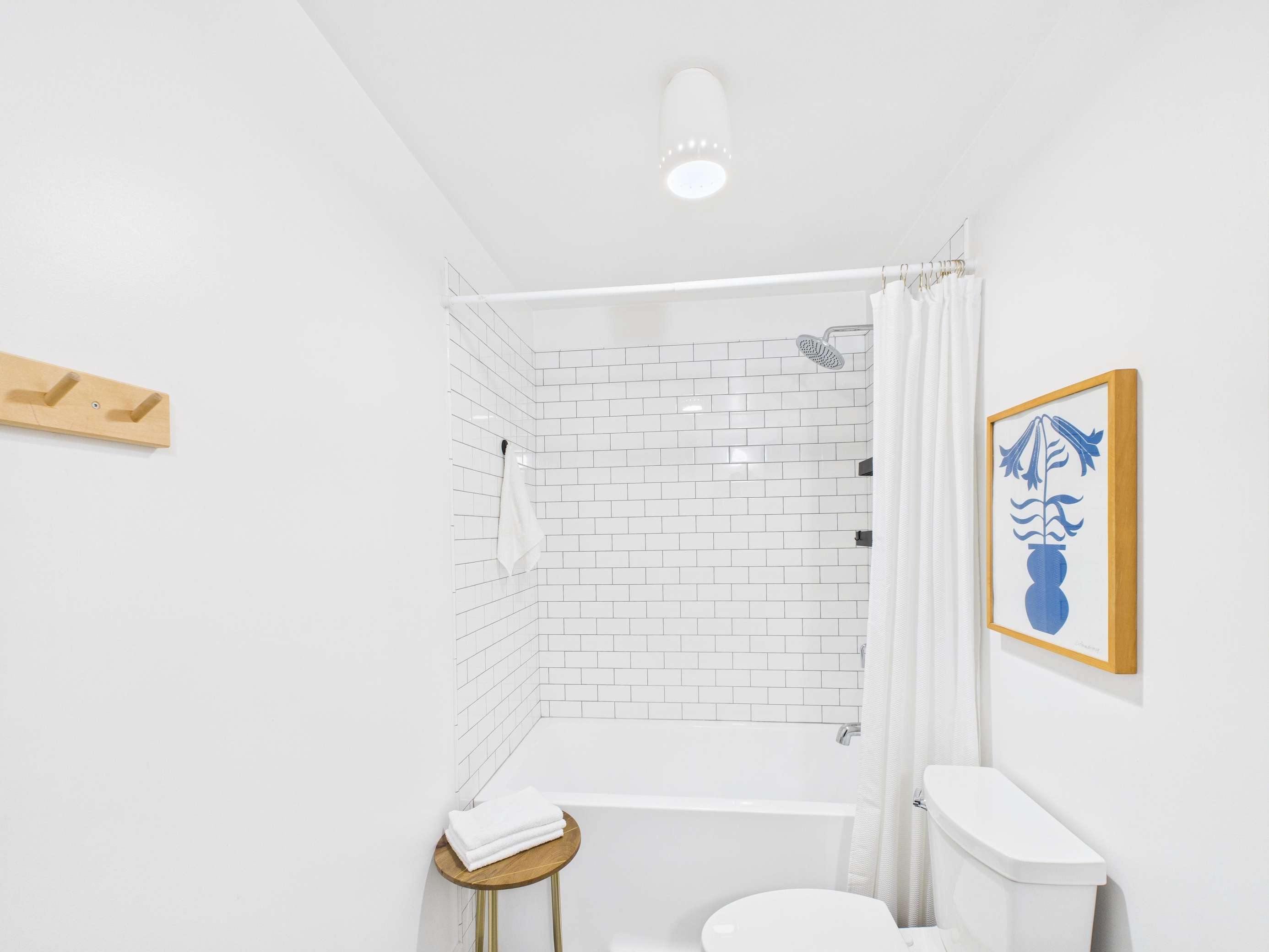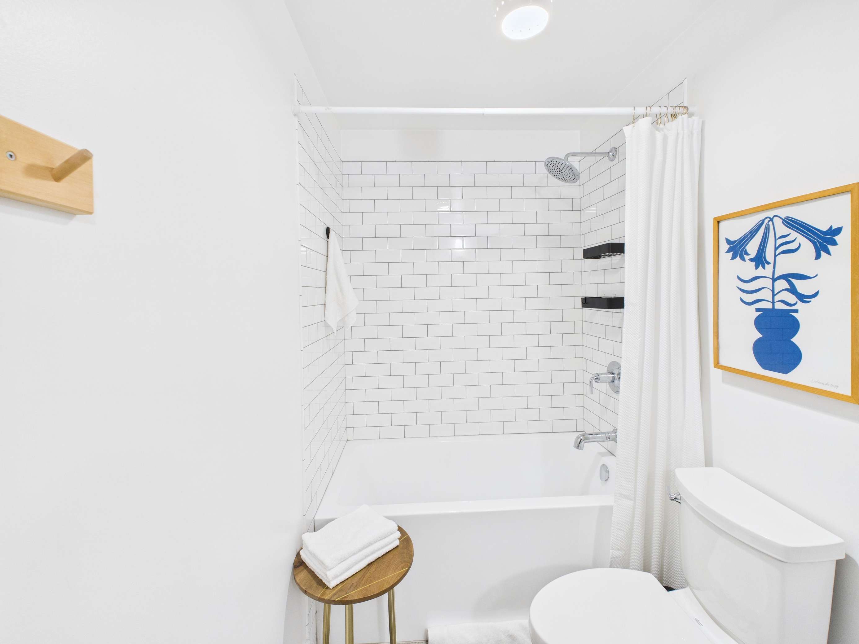 The spacious bathroom invites relaxation with its deep soaker tub and modern fixtures — perfect for unwinding after a long day. Every detail has been thoughtfully selected for both style and quality, from the lighting to the hardware finishes. Wilson Commons is a newer, boutique-style building known for its architectural charm and community atmosphere, complete with secure underground bike storage and Modo car share access for those embracing a car-free lifestyle.
